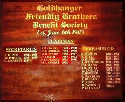 Today the Friendly Brothers still hold their annual dinner at The Chequers just before Christmas, with several members who have left the village making a special journey back to the village to enjoy the event and meet old friends. This plaque displayed in The Chequers gives the names of past and present chairman, secretaries, and treasurers…