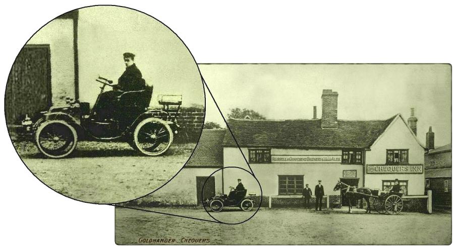 photographed outside The Chequers Inn, Goldhanger in a Pick Motors Voiturette 1906 He was photographed with Eleanor