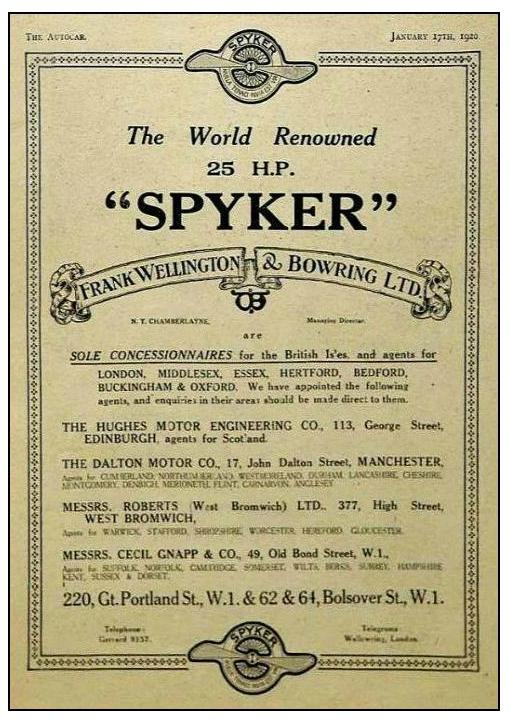 concessionaires for the British Isles for the famous 25hp SPYKER CARS and would be